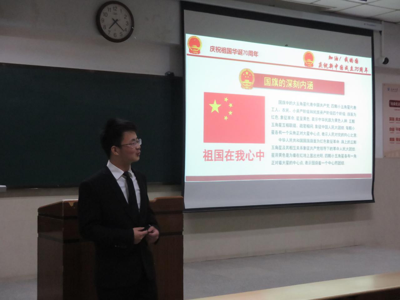 (通讯员 王楚楠)弘扬爱国奋斗精神,建功立业新时代。10月20日晚7:00,浦京集团官网在东校区12教202教室开展“庆祝新中国成立70周年”学习活动,2016级、2018级本科生参加。本次学习活动由2018级应用数学专业研究生沈马锐主讲。