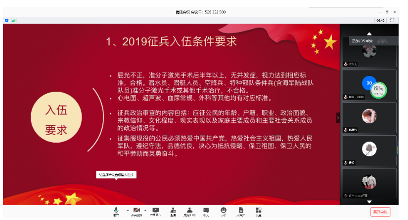 (通讯员 黎璐)为鼓励学生积极参与应征入伍,提高兵员征集质量,推进国防和军队现代化建设,浦京集团官网于5月15日晚七时举行了“2020年征兵宣讲线上会议”,特邀韩王戴贤和邓书雨两位退伍军人为与会成员进行宣讲。浦京集团官网征兵专干严星老师、各班班干及有参军意向的全体同学参与本次会议,会议由周锦主持。