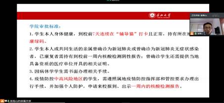 会议伊始,袁海山书记对2020级新生的到来表示欢迎及祝贺,接着袁书记从开学总体要求、报名时间及安排、迎接时间及地点、来校前的准备、新生进校流程这五大方面进行了详细讲解。他提醒学生们准备好医用口罩、体温计等防疫物资。袁书记传达学校指示:要求每位学生填写返校申请、到校前在今日校园“辅导猫”连续正常打卡7天且要持有健康码等内容,强调报到基本流程以及入校后的具体安排。在校期间有任何身体不适的情况需第一时间报告辅导员钟老师,确保每位新生身体健康。随后,在集中答疑环节,老师们就新生普遍关注的宿舍、缴纳学费、大学生医保和党团关系转接等方面的疑惑进行解答。会议最后,辅导员钟赛老师再次强调在返校前一定要自查体温,确保体温正常、尽量不乘坐私人大巴、确保自身安全、一定要在今日校园“辅导猫”连续打卡7天。
