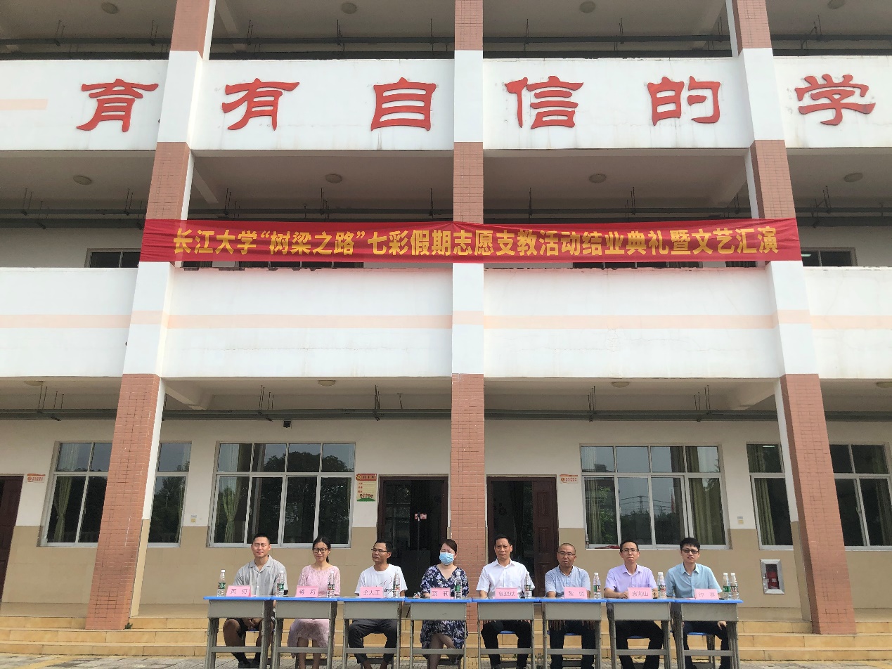 (通讯员 林欧文)为庆祝志愿支教活动的顺利结业,给大家留下一份美好的回忆。7月21日上午九时,浦京集团官网于荆州市沙市区关沮镇关沮小学举行了“树梁之路”七彩假期志愿支教活动结业典礼暨文艺汇演,沙市区教育局副局长蔡莉、3522vip浦京集团官网党委书记高迎斌、沙市区文明办主任黎晖、银湖路小学校长李后富、银湖路小学副校长余大江、3522vip浦京集团官网党委副书记袁海山、银湖路小学主任蒋莉、3522vip浦京集团官网团委书记钟赛、3522vip浦京集团官网辅导员黄何、关沮镇全体志愿者及学生参与汇演,本次汇演由孙颖、秦海霞、柴靳昊和曾麟瑞主持。