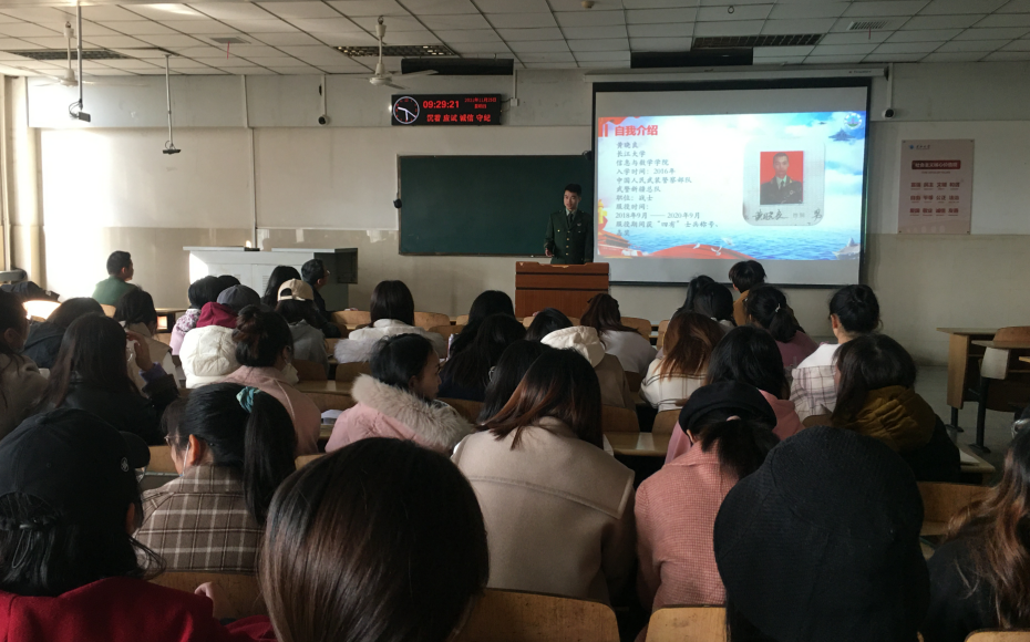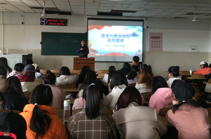 (通讯员 黄晓良)为响应国家号召,鼓励毕业大学生投身军营。11月25日上午9时,3522vip浦京集团官网于12教202举办了“2022届毕业生征兵宣讲”活动,出席本次活动的有院党委副书记袁海山,辅导员严星、黄何老师以及全体2022届毕业生。本次大会由副书记袁海山主持。