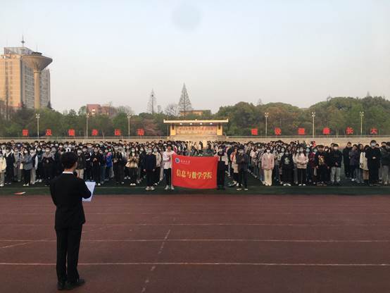 随后,院党委副书记袁海山致辞,他以古人中外有识之士懂得珍惜时间及某些同学不懂得时间的珍贵而错失机会来激励大家要珍惜时光,好好学习。对于学生,应该怎么珍惜时间,取得成就的问题,袁书记总结了以下三点:要有吃苦的勇气与毅力,要养成良好的习惯,尤其为作息习惯,要有自己的学习目标,做好时间规划,把握当下。其次,袁书记为我们讲述了疫情防控的严峻性与重要性,要求我们加强个人防护,保持社交距离,非必要不出校,非批准不返校,严格遵守疫情防控纪律要求,坚信在党的坚强领导下,我们万众一心、众志成城,一定会取得疫情防控的最终胜利。最后同学们列好队形,袁书记带领全体师生进行了晨跑。