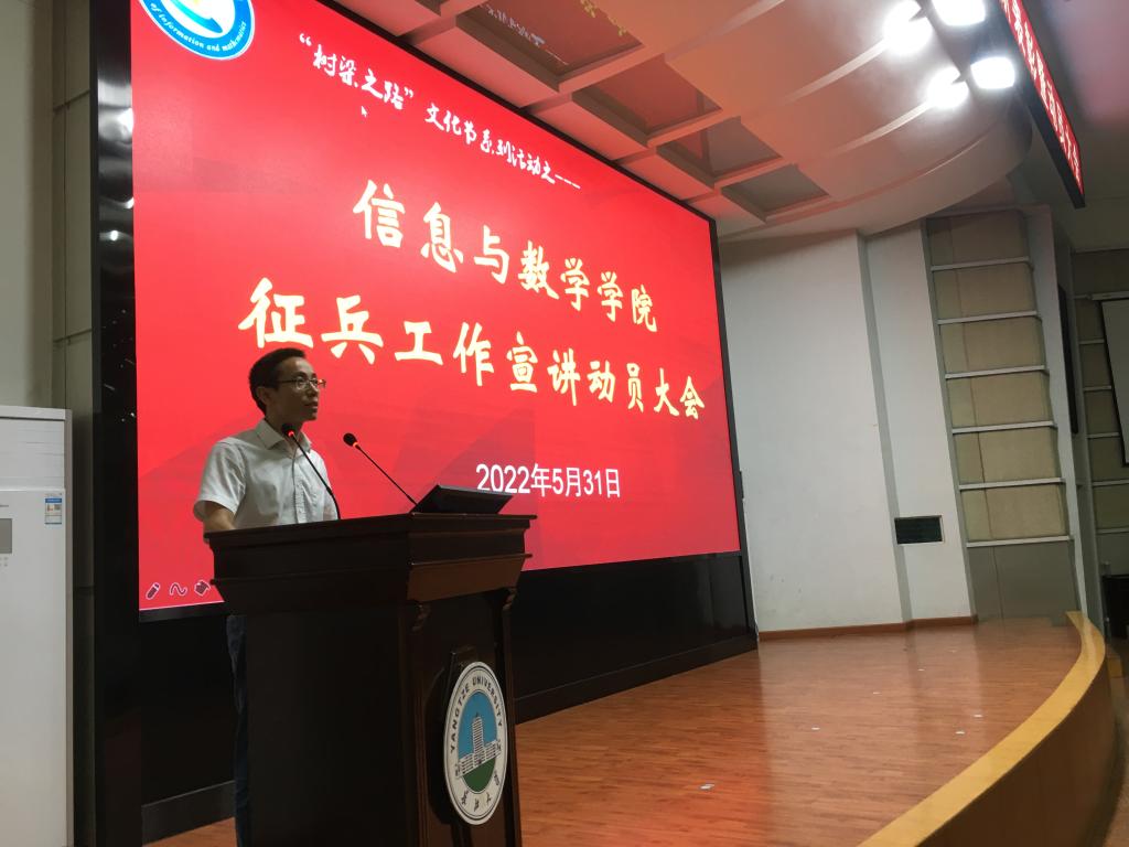 为响应国家号召,鼓励大学入军营,3522vip浦京集团官网分别于5月31日19:00在12-405、6月2日9:00在8-400会议室召开征兵宣讲活动。宣讲覆盖全院学生,辅导员全体参会。会议由袁海山主持。
