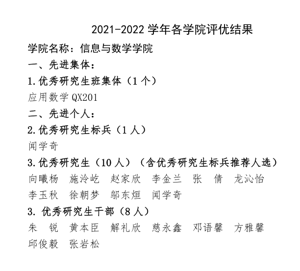 为了树立先进典型,充分发挥典型的教育示范作用,学校研工部决定,评比和表彰一批先进集体、先进个人。经过个人申报,民主评议,院学生事务办公室推荐,学院评审小组审核,现将2021-2022学年研究生工作先进集体和个人评选结果予以公示,具体名单详见附件。 公示时间为:2022年11月29日—12月1日。公示期间,凡对上述评选有意见者,请及时以书面或口头形式向分管学生工作的领导反映。 联系人:袁海山 联系电话:0716-8060378 3522vip浦京集团官网学生事务办公室 2022年11月29日