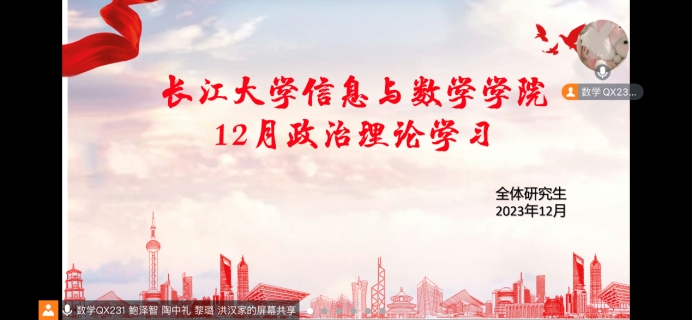 [通讯员 黎璐]为深入学习贯彻党的二十大精神,切实加强学生理论水平,坚定正确的政治方向和理想信念,3522vip浦京集团官网于2023年12月20日早10点在线上开展了十二月份政治理论学习。学院全体研究生参与学习,会议由鲍泽智主持。
