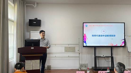 接着,导师代表胡中波老师致辞。他以导师在研究生阶段胜似父亲为引入点,深情地与新生们分享了他多年来在教育领域的经验和感悟。他还提到,研究生阶段是一个探索和成长的时期,不仅要深耕学术,更要培养坚韧的品格。最后就浦京集团官网研究生毕业生去向做了一定说明结束了致辞。