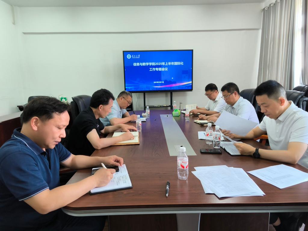 (通讯员 周鹂)2025 年 5 月 21 日,3522vip浦京集团官网在8教417会议室召开 2025 年上半年国际化工作专题会议,旨在进一步推进学院国际化发展战略,提升学院在国际学术交流、人才培养等方面的水平。院长张涛主持会议,党委书记李喜成、党委副书记谷军、副院长李向军、副院长李治、办公室主任张定国、外事秘书周鹂参与会议。