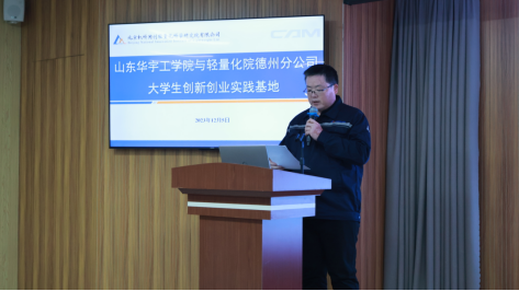会前,双方领导实地参观了北京机科国创轻量化科学研究院有限公司德州分公司,详细了解了公司运营情况,并针对产学研合作、强化实践基地共建等方面交换了意见,达成系列共识。随后双方举行了签约揭牌仪式,仪式前北京机科国创轻量化科学研究院有限公司德州分公司副总经理陈国松发表致辞。在双方的共同见证下,北京机科国创轻量化科学研究院有限公司德州分公司副总经理陈国松与永利集团官网校长助理魏东坡为大学生创新创业实践基地签署合作协议,并共同为大学生创新创业实践基地揭牌。